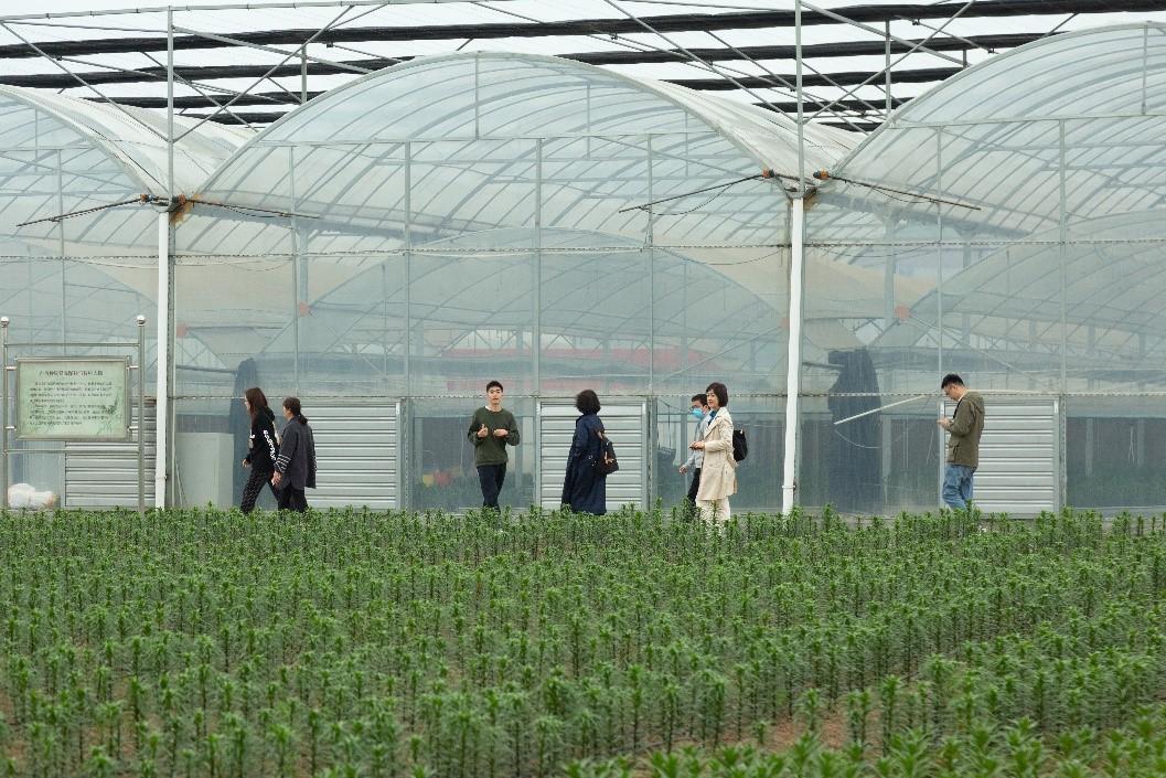 上图为调研组考察八卦洲外沙村的百合育种大棚