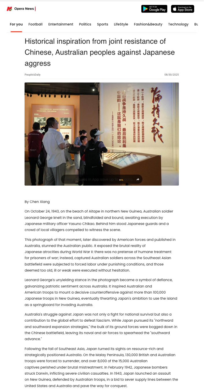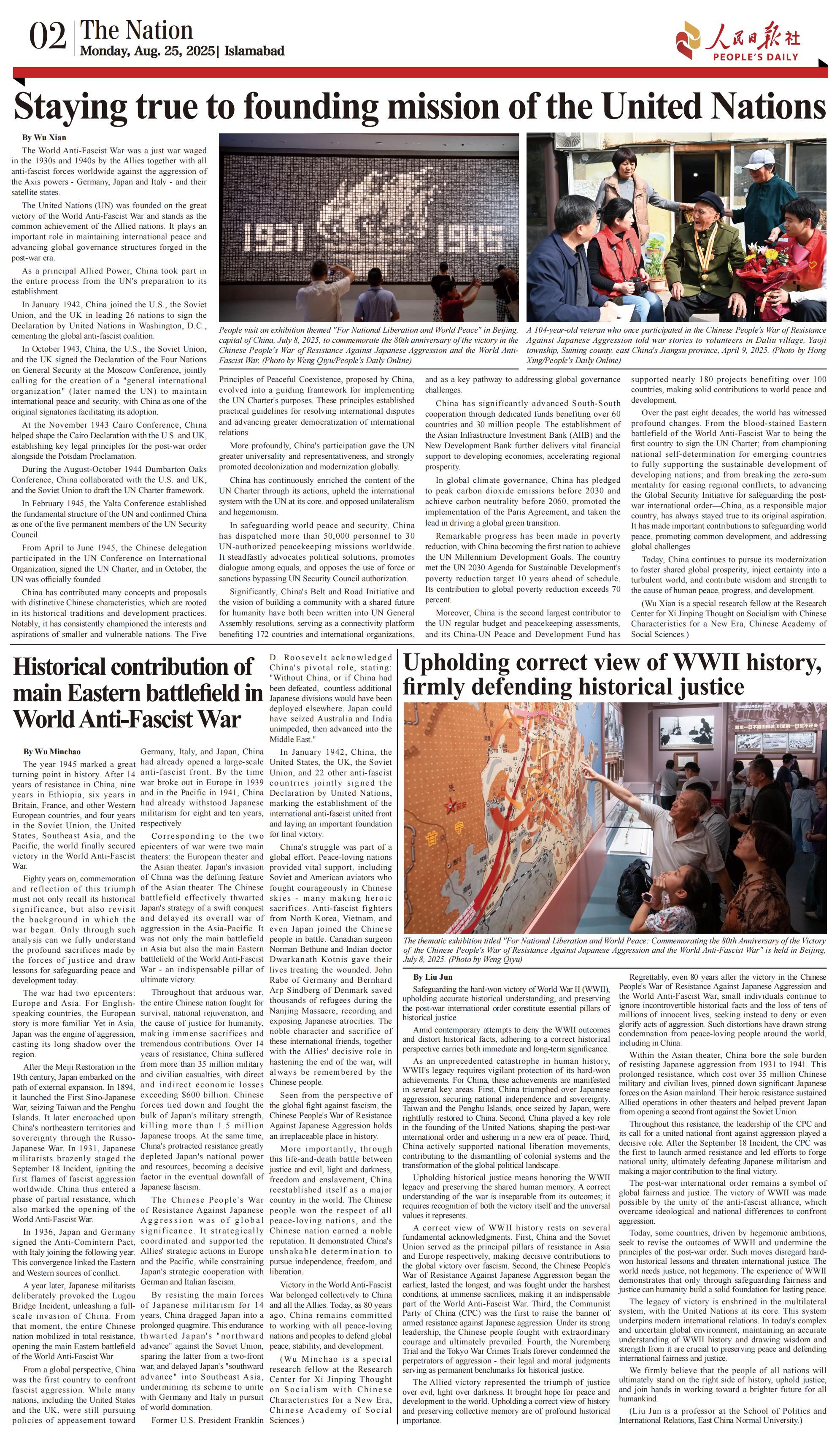 中国社科院日本研究所吴限、陈祥、邹皓丹,世界历史研究所张跃斌以及近代史研究所吴敏超等学者应《人民日报》约稿,围绕中国人民抗日战争暨世界反法西斯战争胜利80周年主题发表相关评论文章。文章经翻译成英语、法语、西语、俄语、韩语、阿拉伯语、匈牙利语等10余种语言,在西班牙、匈牙利、泰国、印度尼西亚、柬埔寨、巴基斯坦、哈萨克斯坦、韩国、南非、坦桑尼亚、塞内加尔、肯尼亚、阿曼、伊朗、科威特、伊拉克、圭亚那、墨西哥等近30个国家的近40家媒体刊发。落地媒体包括西班牙《先锋报》、匈牙利《民主主义者周刊》、泰国《经理报》、印度尼西亚《雅加达邮报》、柬埔寨《高棉时报》、巴基斯坦《国民报》、哈萨克斯坦《实业报》、韩国《韩民族日报》、南非《星报》、坦桑尼亚《卫报》、塞内加尔《南方日报》、肯尼亚《星报》、阿曼《青年报》、伊朗《德黑兰时报》、科威特《报章报》、伊拉克《时代报》、《圭亚那纪事报》、墨西哥《改革报》等。文章也在《环球时报》等媒体网站同步刊发,多家媒体在头版刊发导读,使相关报道在当地舆论场形成较强传播效应。